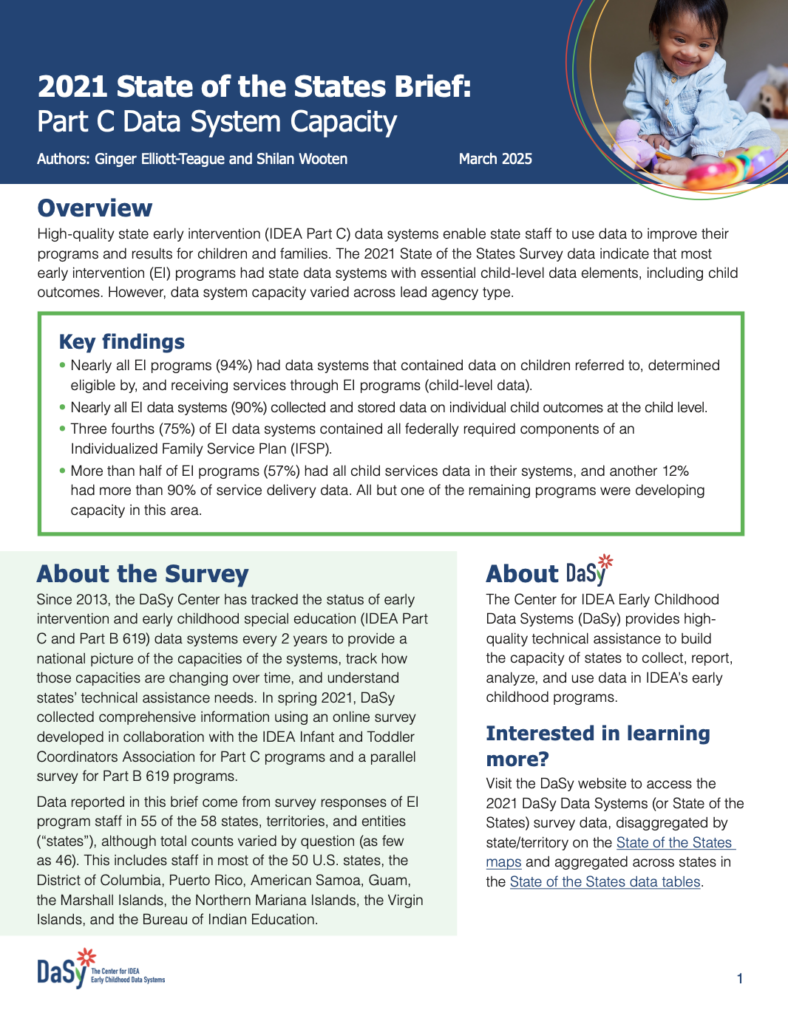 High-quality state early intervention (IDEA Part C) data systems enable state staff to use data to improve their programs and results for children and families. This Brief provides an overview of states’ early intervention data system capacity and describes differences based on lead agency type.