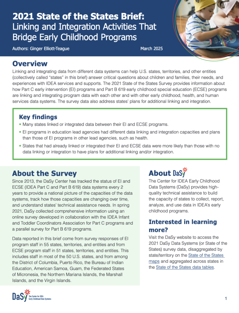 Linking and integrating IDEA data with different data systems can help U.S. states, territories, and other entities answer critical questions about children and families, their needs, and experiences with IDEA services and supports. This Brief shares what states were doing in spring 2021 to share, link and integrate their IDEA data with data from other early childhood programs.